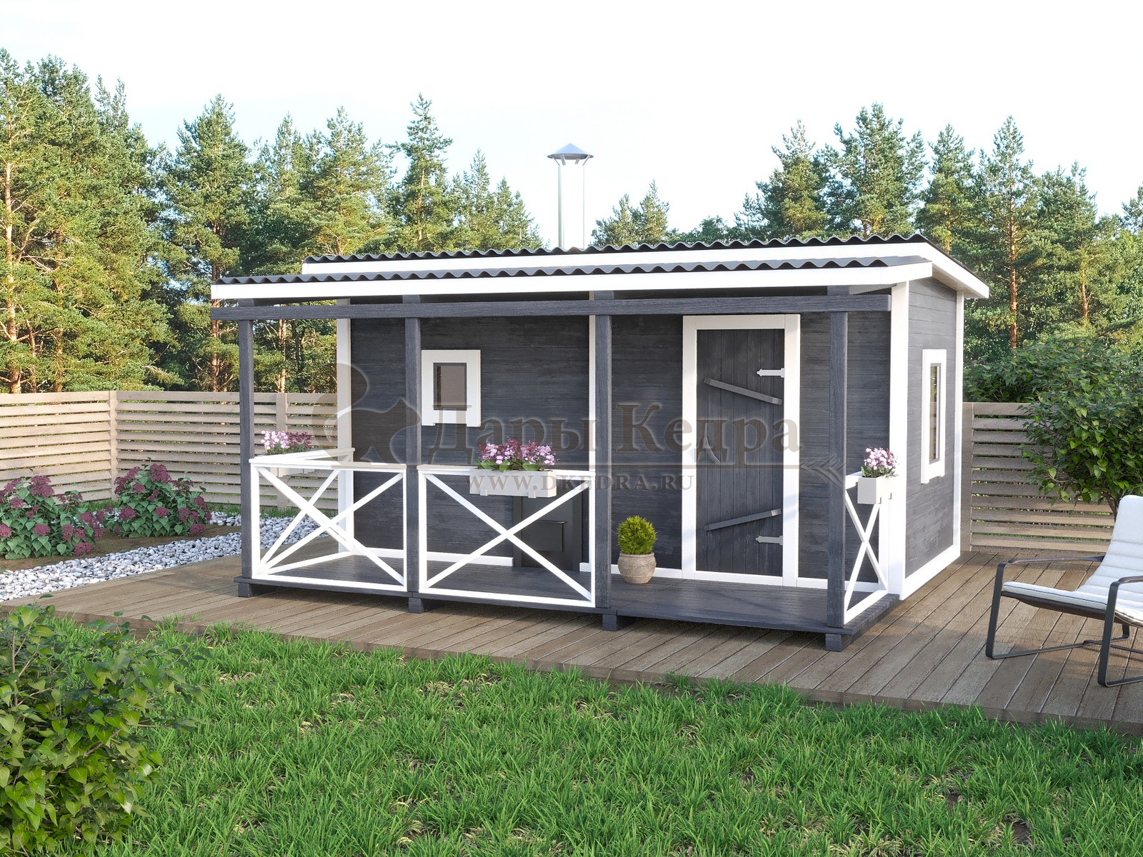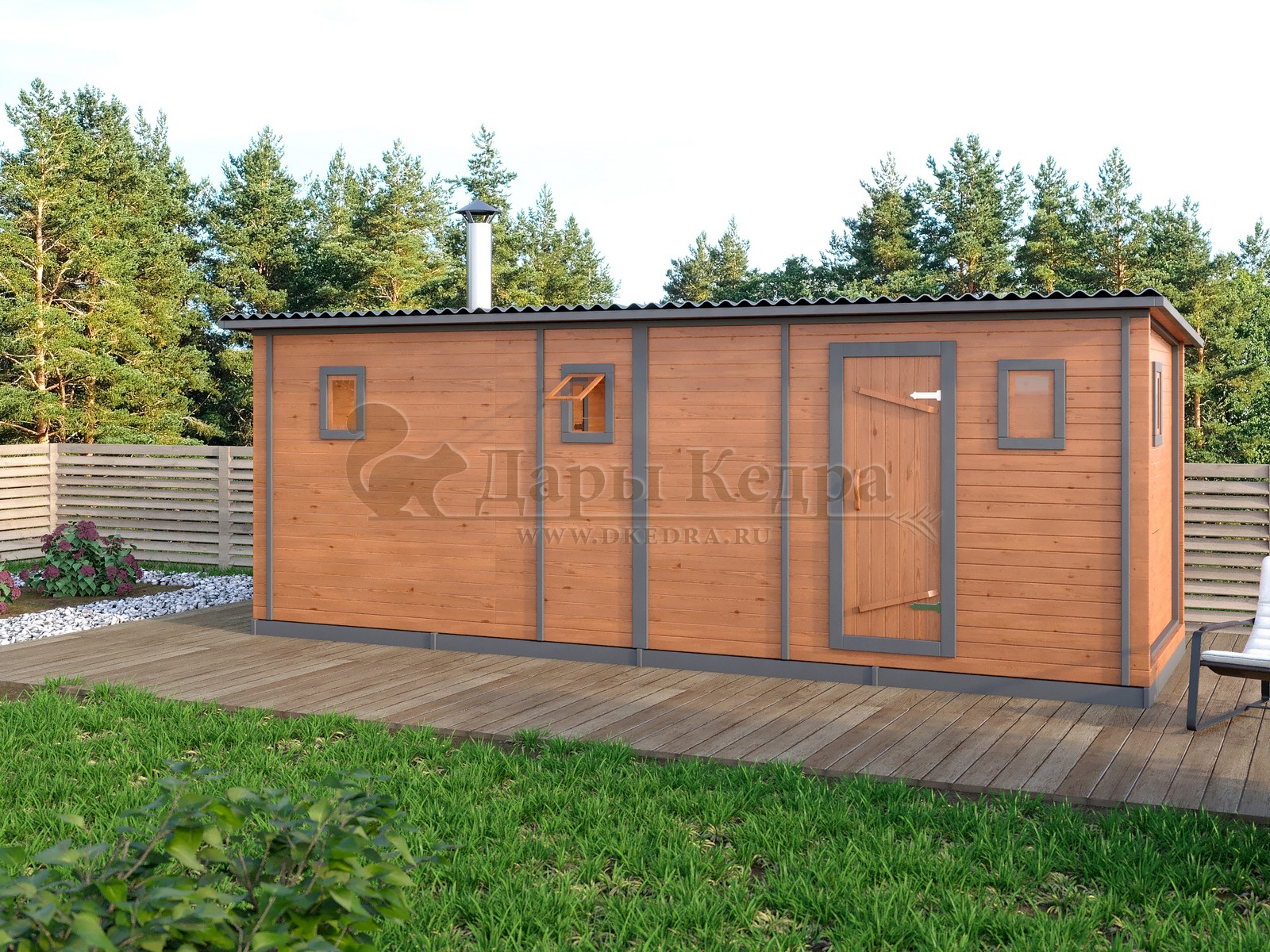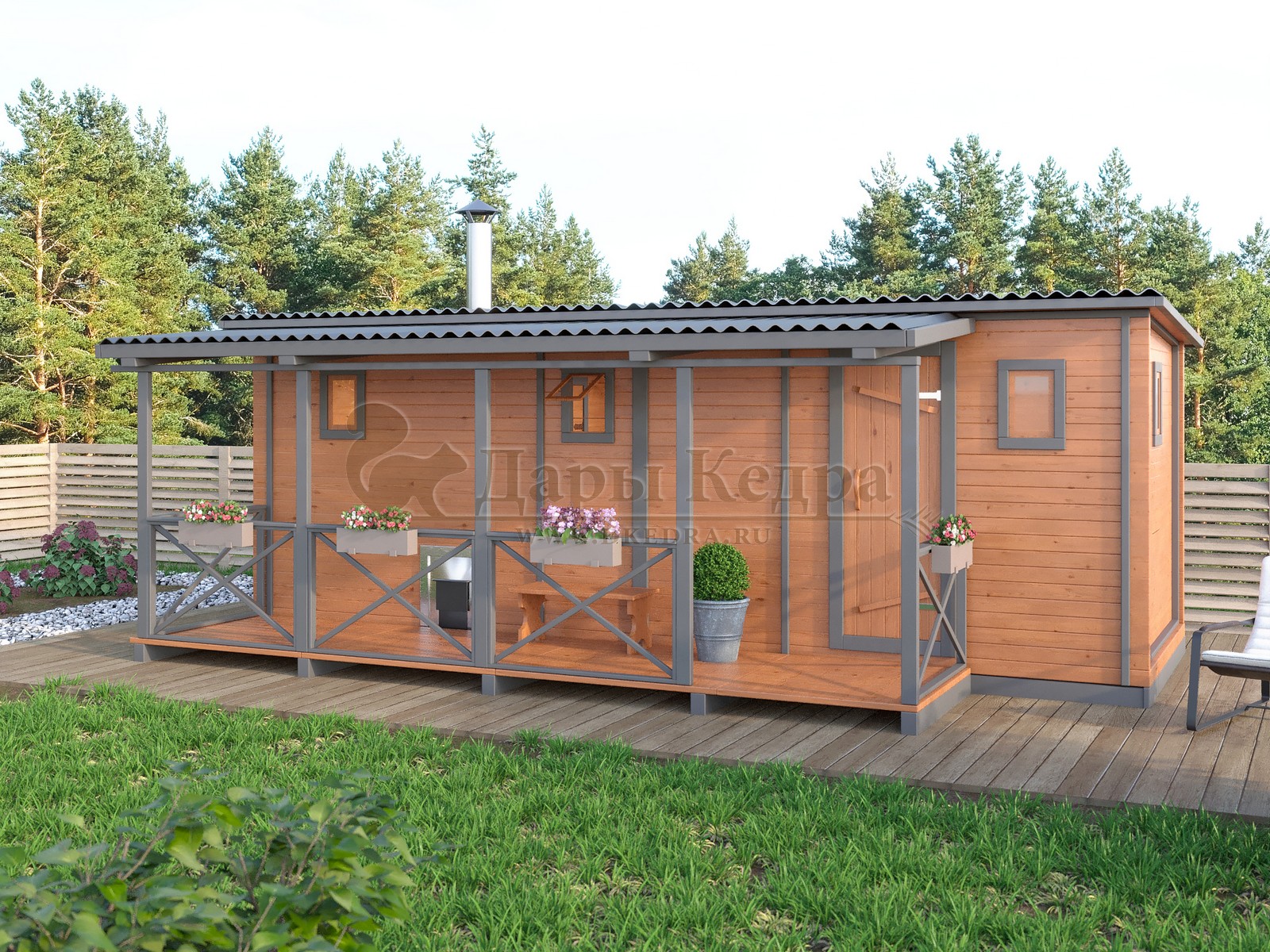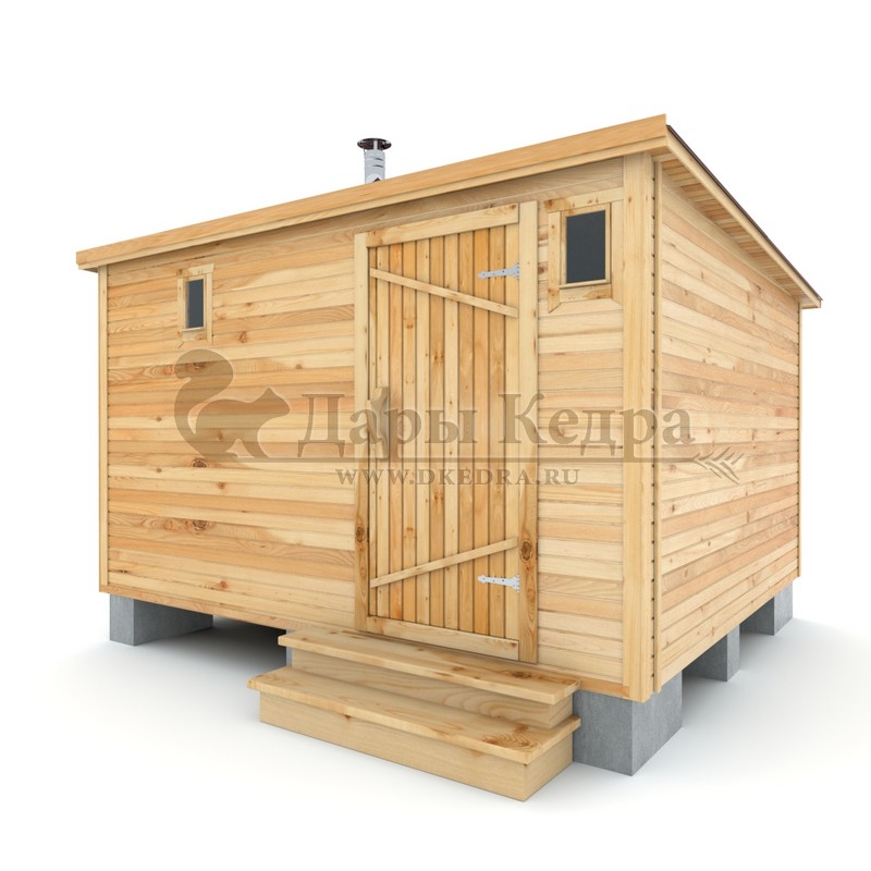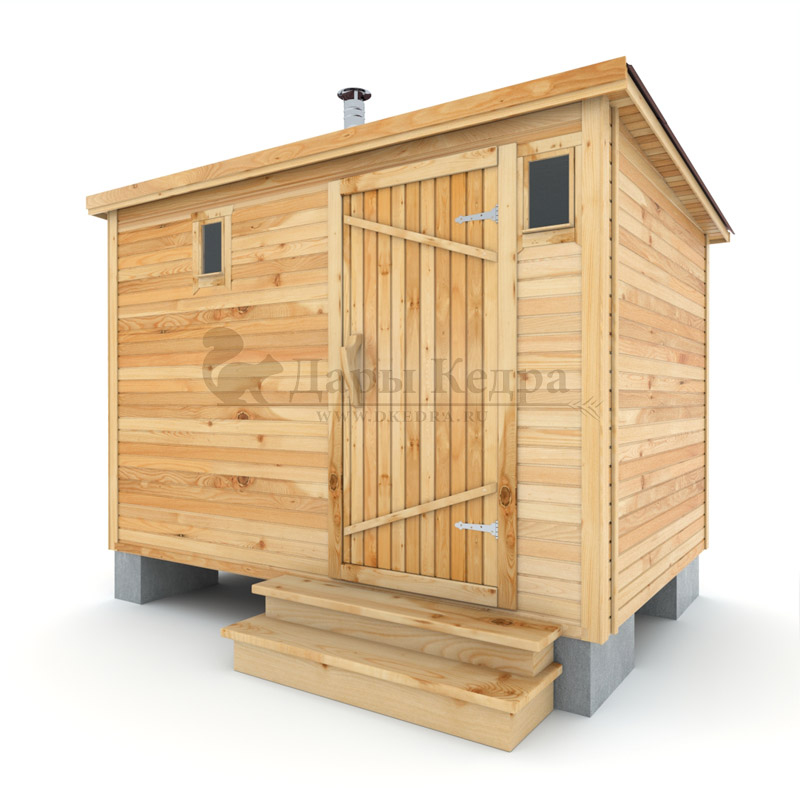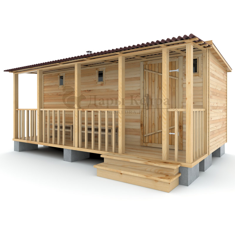 Каркасно-щитовая баня из кедра «Мини» с верандой Это классическая прямоугольная модель бани с двумя отделениями: парилкой и раздевалкой. Для удобства пользования раздевалка оснащена лавочкой и вешалкой. Парилка оборудована двухуровневым открытым полком и печью. За счет небольшой конструкции баня нагревается в течении 30 минут. На просторной веранде можно оставить вещи или отдохнуть после парения. Каркасно-щитовую баню можно заказать как в готовом, так и в разборном варианте. В разборной модели готовые щиты из кедра быстро собираются в полноценное строение, что также позволяет исключить лишний строительный мусор. Такая баня не требует полноценный фундамент, поэтому при необходимости ее можно перенести в другое место. Обращаем Ваше внимание, что в стандартную комплектацию бани входит полок открытого типа в парной. Дополнительно можно заказать полок закрытого типа или лавку! Древесина кедра насыщена эфирными маслами и фитонцидами, которые активируются при воздействии температур. Таким образом, парение в каркаско-щитовых банях из кедра становится еще полезнее.