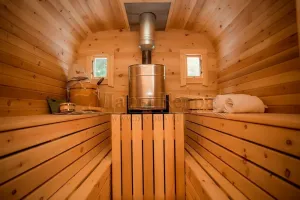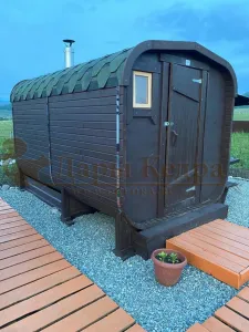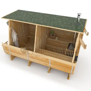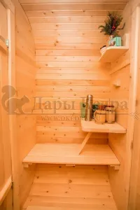Это прямоугольное изделие с закругленными углами. За счет такой конструкции во время топки воздух циркулирует по кругу, поэтому баня-бочка нагревается не более 30 минут. Баня включает в себя раздевалку и парилку. Лавочки из кедра установлены по всей длине бани-бочки с обеих сторон. Печь расположена в парилке около дальней стены. Для удобства пользования в раздевалке находится вешалка и полочка из кедра. По вашему желанию баню-бочку квадро можно укомплектовать козырьком, верандой и печью с внешней загрузкой, благодаря которой весь мусор после топки остается на улице. Баня-бочка квадро не требует полноценный фундамент, поэтому при необходимости ее можно перенести в другое место.