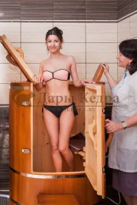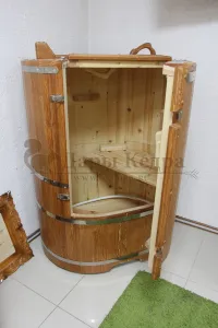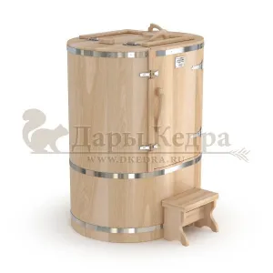 Овальная фитобочка из кедра - это мини парная, которую можно использовать не только в спа-салонах, но и дома. Овальная модель более просторна и удобна в использовании. Толщина стенок составляет 25 мм. Она оборудована откидными створками, дверцей и отверстием для головы. Во время парения человек сидит внутри кедровой бочки, а голова находится снаружи. Благодаря этому исключается возможность перегрева. Подлокотники из кедра, встроенные ручки на створках и двери делают эксплуатацию более удобной.
