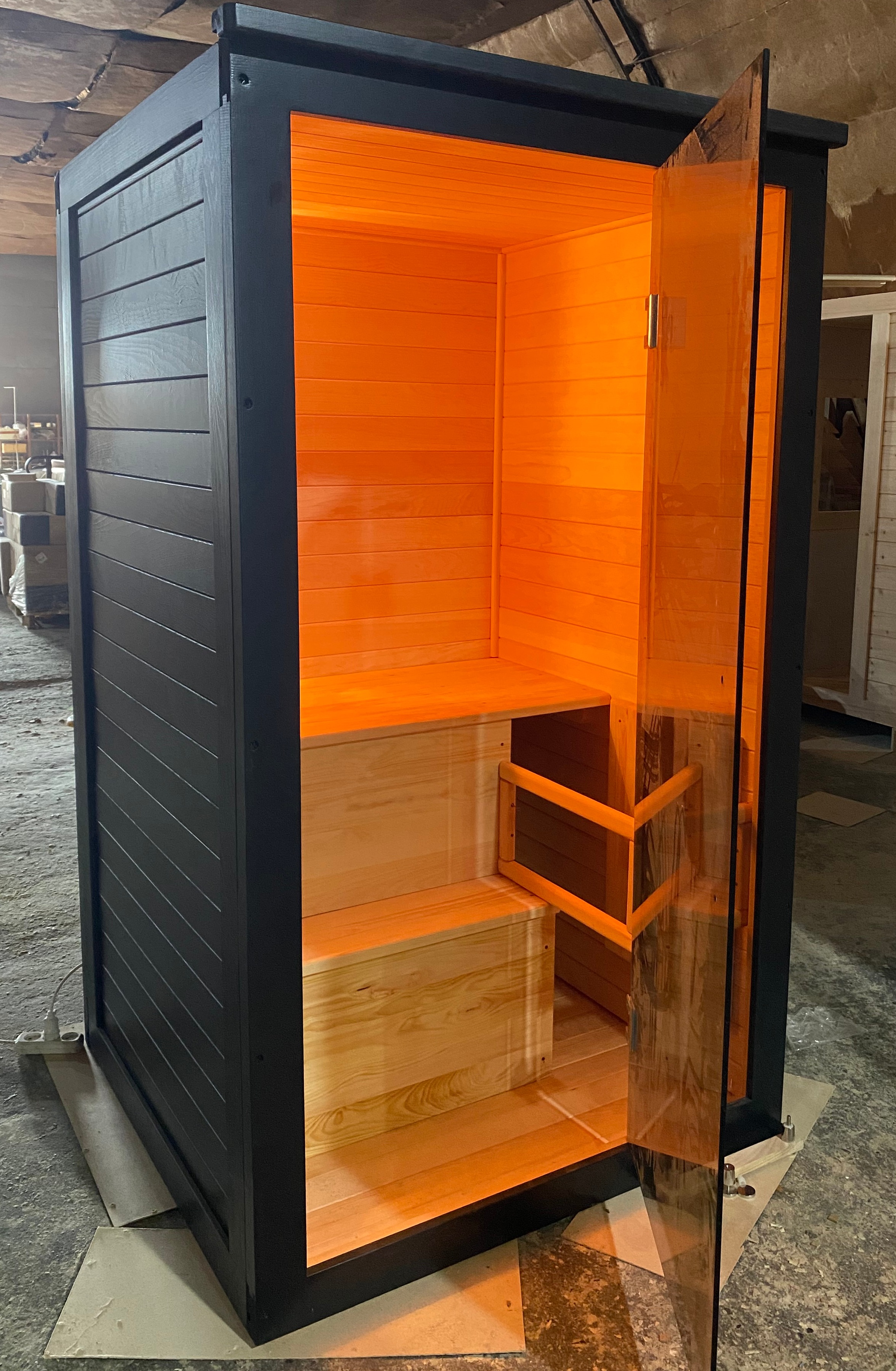 Это специально оборудованная кедровая кабина для прогрева тела человека сухим теплом. Воздух в таких парных не нагревается. Инфракрасные лучи воздействуют на тело, равномерно прогревая мышцы, суставы и органы. Керамические излучатели похожи на лампы, имеют высокую температуру нагрева, поэтому защищены противоожоговыми решетками. Тело человека в таких саунах нагревается интенсивнее. Работает кабина за счет электричества. Установка сауны в угол, позволяет рационально использовать пространство помещения. Подходит как для домашнего использования, так и для коммерции.
