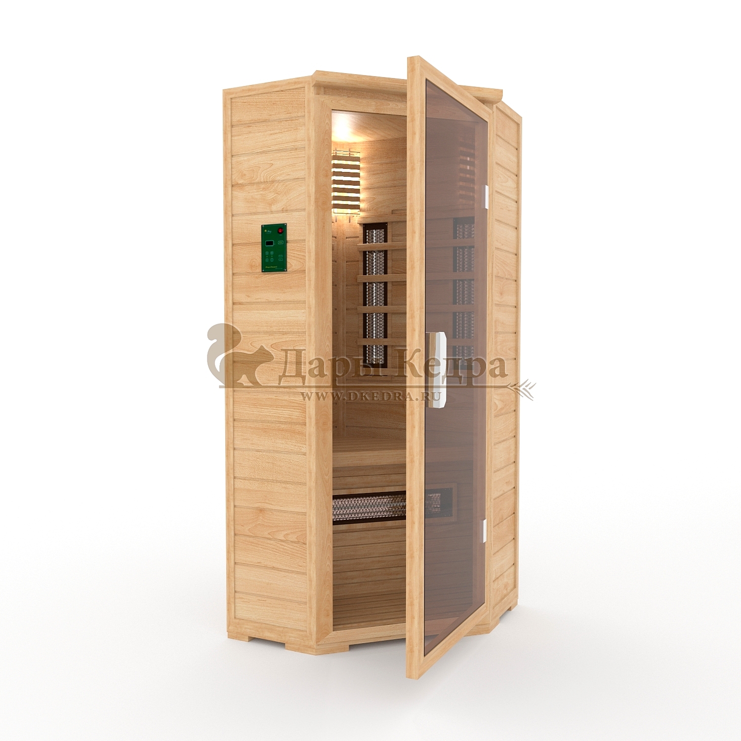 Одноместная угловая инфракрасная сауна кабина из кедра и липы с карбоновыми излучателями Это специально оборудованная кабина из липы для прогрева тела человека сухим теплом. Воздух в таких парных не нагревается. Инфракрасные лучи воздействуют на тело, равномерно прогревая мышцы, суставы и органы. Карбоновые излучатели, встроенные в стены кабины, обладают мягким прогревом, что полностью исключает возможность ожога. Работает кабина за счет электричества. Установка сауны в угол, позволяет рационально использовать пространство помещения. Подходит как для домашнего использования, так и для коммерции. Обращаем Ваше внимание что в стандартную комплектацию входит трапик для ног, но вы можете его заменить на цельный пол совершенно бесплатно!