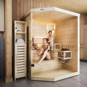 Это специально оборудованная готовая деревянная кабина для сухого и влажного парения. Электропечь нагревает пространство внутри и позволяет сбрызгивать камни водой, слегка увлажняя воздух. Такая процедура позволяет избежать перегрева. Каркас сауны выполнен из массива кедра, снаружи и внутри обшит липовой вагонкой сорта «Экстра» и имеет теплоизоляционный слой. Также двухуровневый полок идёт из кедра для обогащения внутри кабины полезными фитонцидами, а в сочетании с противовирусными свойствами липы сауна становится настоящим источником здоровья.